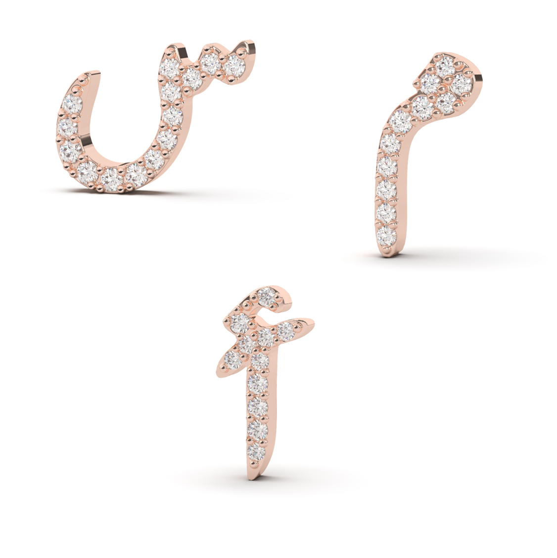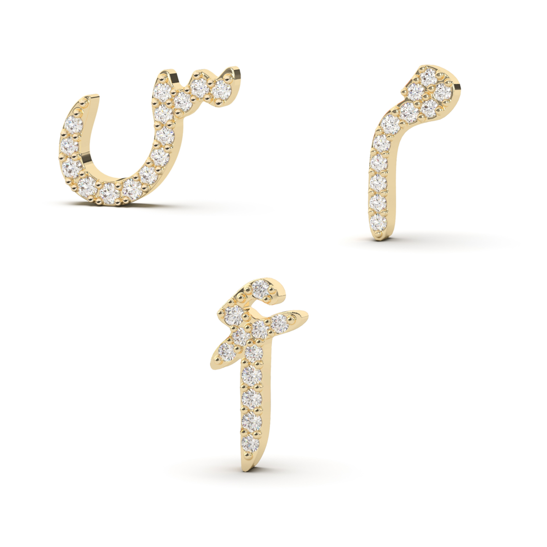 اقتني حرفك العربي المفضل مرصعاً بالألماس من مجموعة أبجد هوَّز من مجوهرات باللغة العربية، صممنا هذه المجموعة بطريقة تسمح لك ارتداء الحلق في أي ثقب في اذنك، حيث ان الجزء الخلفي من الحلق عبارة عن كرة مصممة خصيصا لترتدين حرفك بكل أريحية