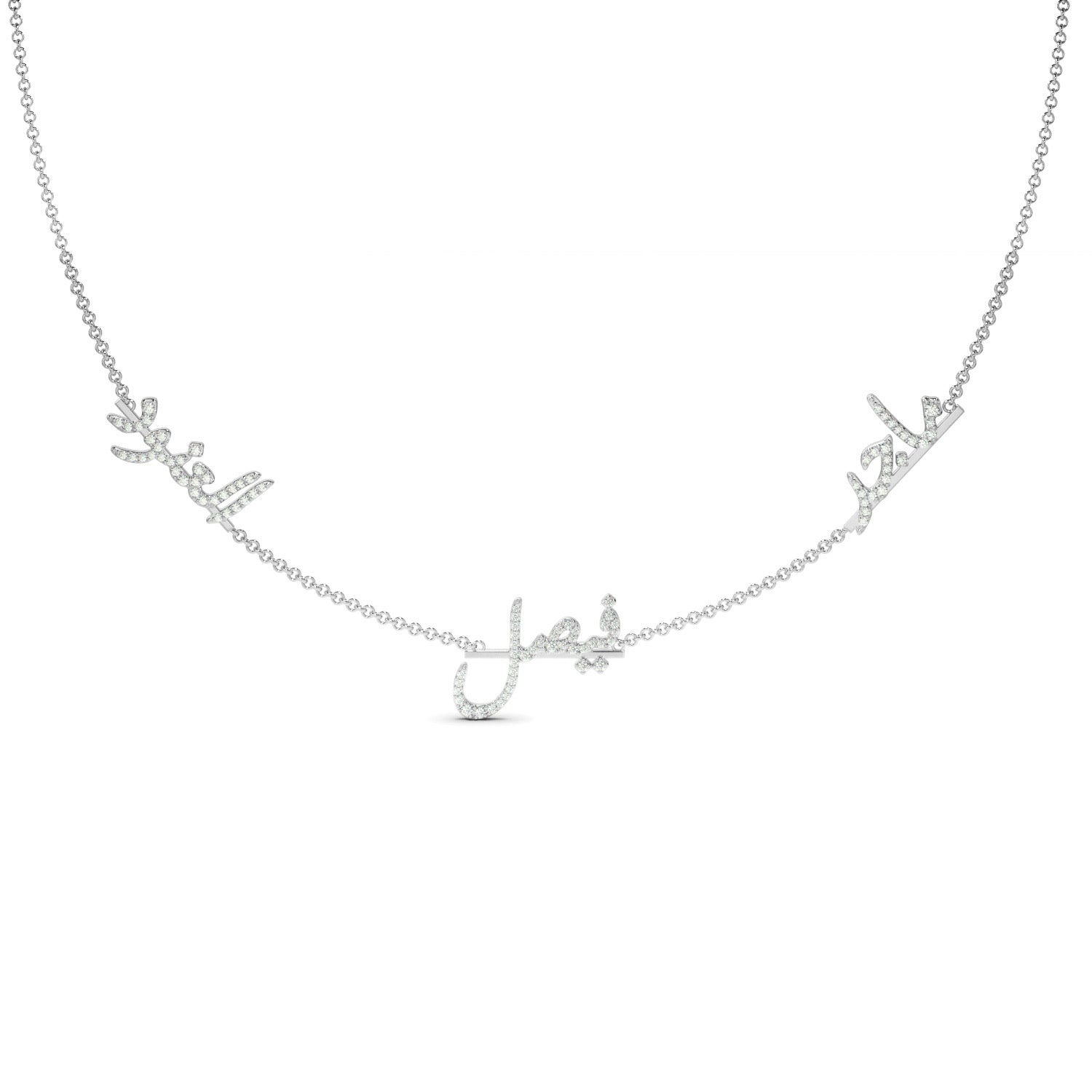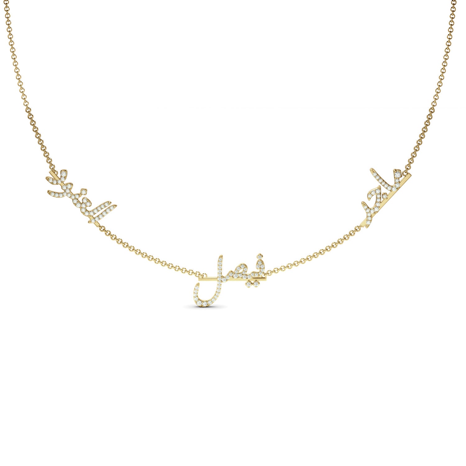 Design yours and your loved ones' names in Arabic paved with Diamonds on a line made out of gold from our Pavé Name & Gold Satter collection.